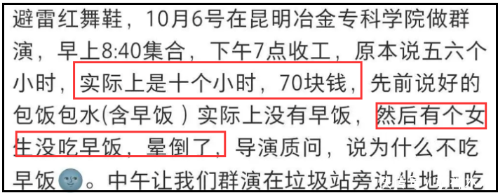 条件恶劣只是其中之一,让群演最无法接受的是,拍摄时间比预想的要长。他们从早上9点左右开始拍摄,但为了配合主演,期间一直被扔在太阳底下暴晒,直到晚上才结束,算下来是整整工作了11个小时,只得到70元酬劳。
