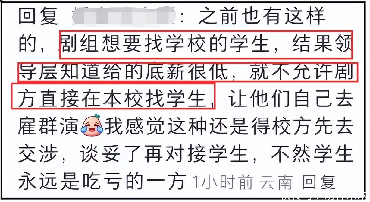 有网友爆料,此前也有其他剧组进其他学校拍摄,但校方得知工资太低后,就坚决不允许学生参加了。如此看来,剧组把大学生当成廉价劳动力的情况已经很普遍,但却很少有人站出来维权。