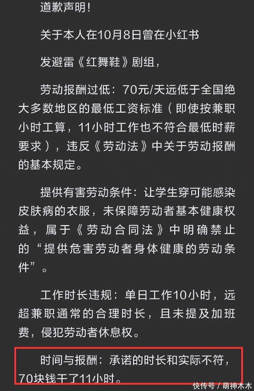 国庆期间,有大学生群演发文吐槽红舞鞋剧组,表示拍摄现场条件恶劣,剧组不管早餐,也没有给水,如果想喝水,得徒步走一公里,用一次性纸杯接着喝。另外,女生换衣服时也没有遮挡物,吃饭只能站在垃圾房旁。